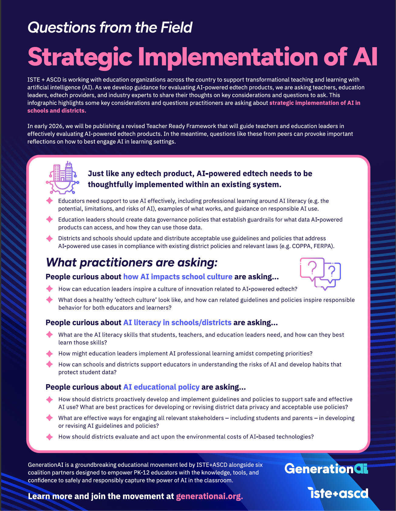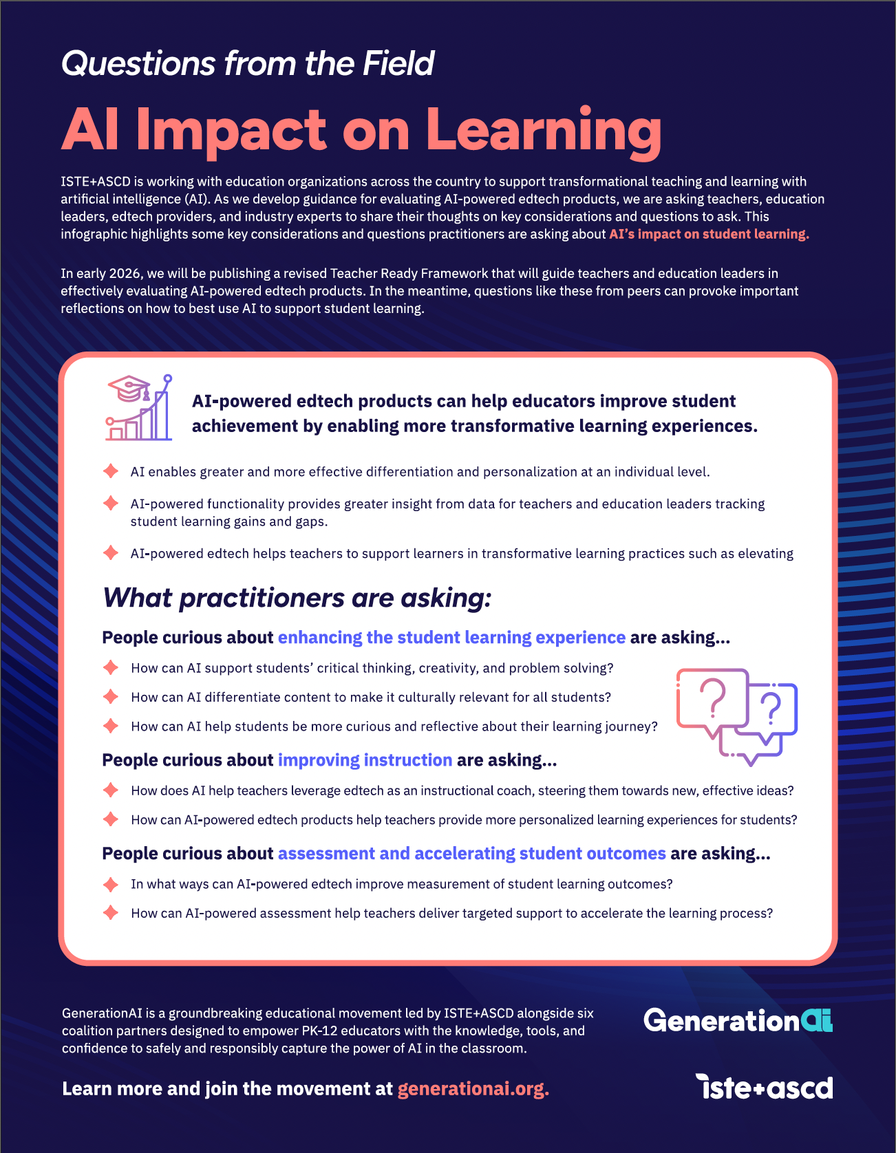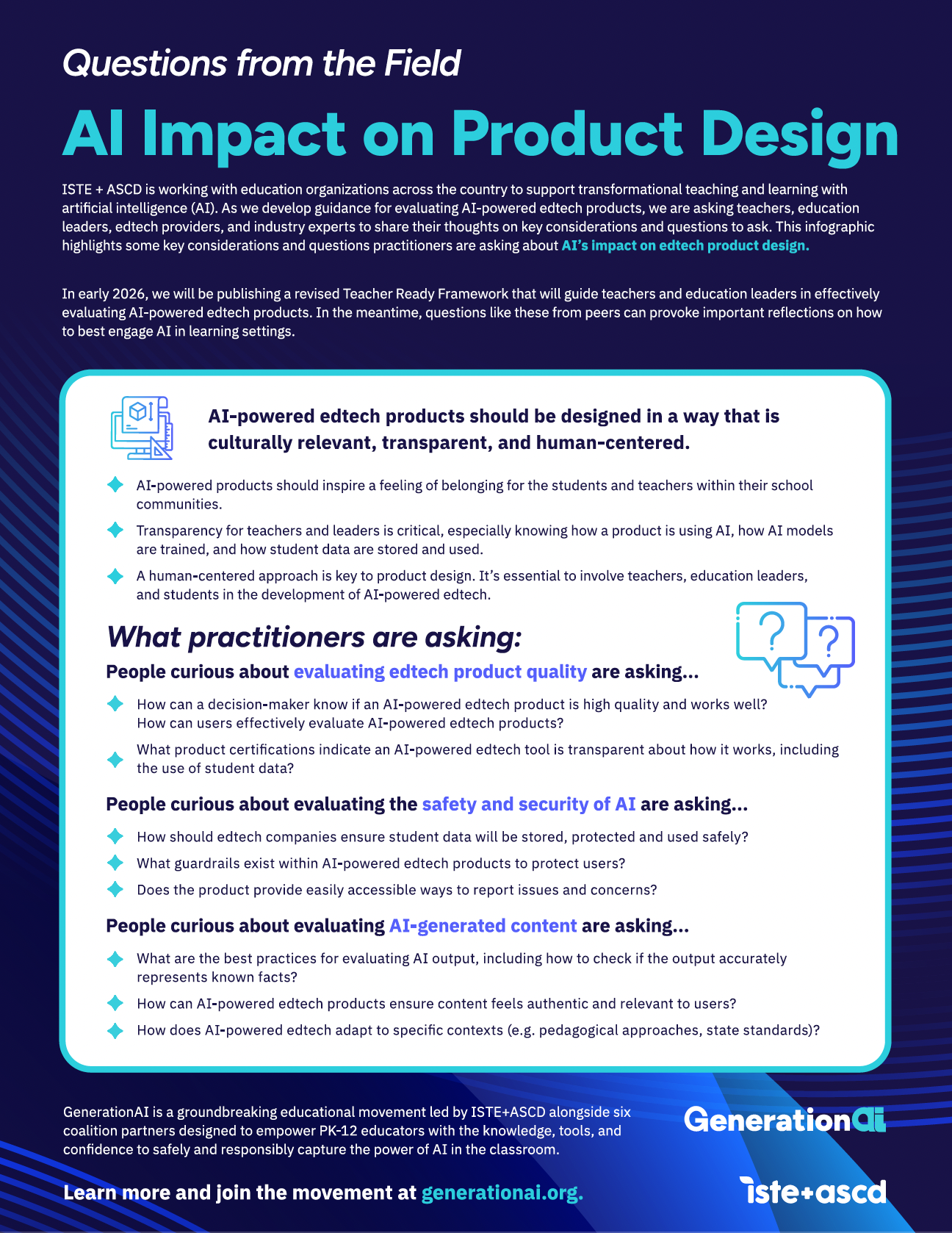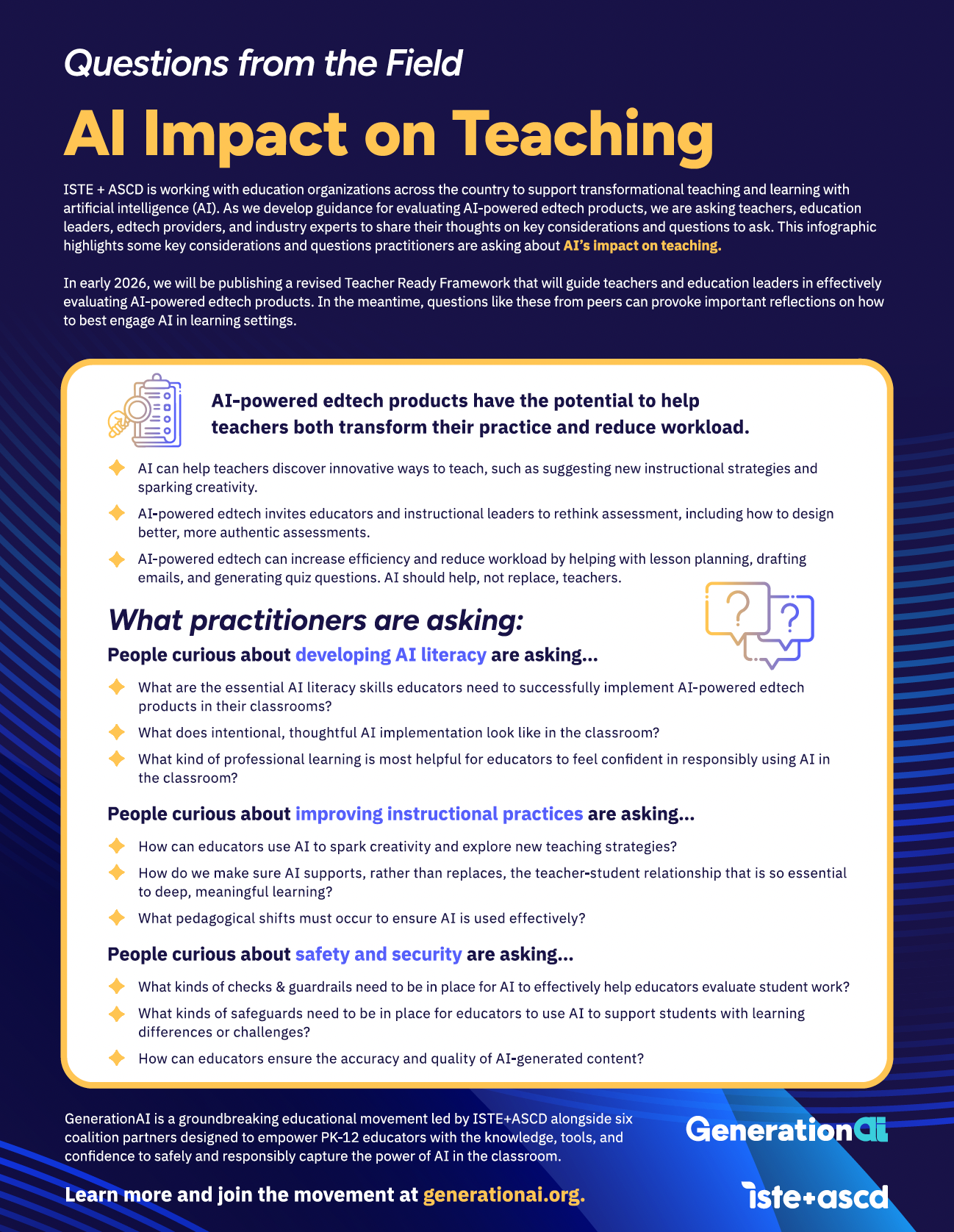 These four infographics deep dive into the main themes from our original Insights from the Field About AI-Powered Tech and explore the types of questions we’re hearing from education practitioners about AI’s impact on education today. These questions inform the updates to the Teacher Ready framework, which will be released in early 2026.